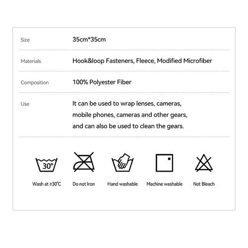 Το Camera Protective Wrap από την TTArtisan είναι ένα πανί 35 x 35 εκ. από πολυεστέρα από μικροΐνες που έχει σχεδιαστεί για να καλύπτει και να προστατεύει φακούς, κάμερες, κινητά τηλέφωνα και άλλο εξοπλισμό. Για ασφαλή περιτύλιξη και πλένεται στο χέρι και στο πλυντήριο .