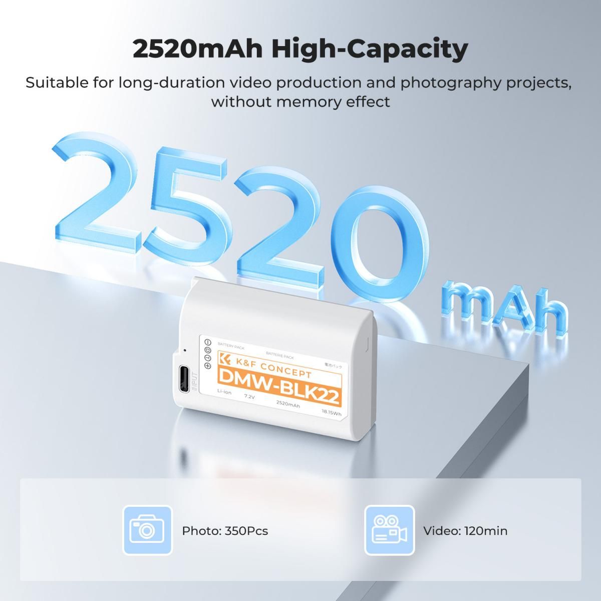 Σχεδιασμένες με ισχυρή χωρητικότητα 2400mAh, τάση 7,2V και ενέργεια 18,15Wh, οι μπαταρίες DMW-BLK22 είναι κατασκευασμένες για να διαρκούν, παρέχοντας εκτεταμένη ισχύ για μεγάλες φωτογραφίσεις και βίντεο, εξαλείφοντας την ανησυχία για εξάντληση της μπαταρίας.