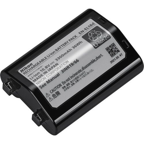 The Nikon EN-EL 18d Rechargeable Lithium-Ion Battery has a capacity of 3300mAh, an output of 10.8V, and 36Wh. The battery can charge within the MH-33 charger and it can be used as a spare or replacement battery for the Nikon Z 9.