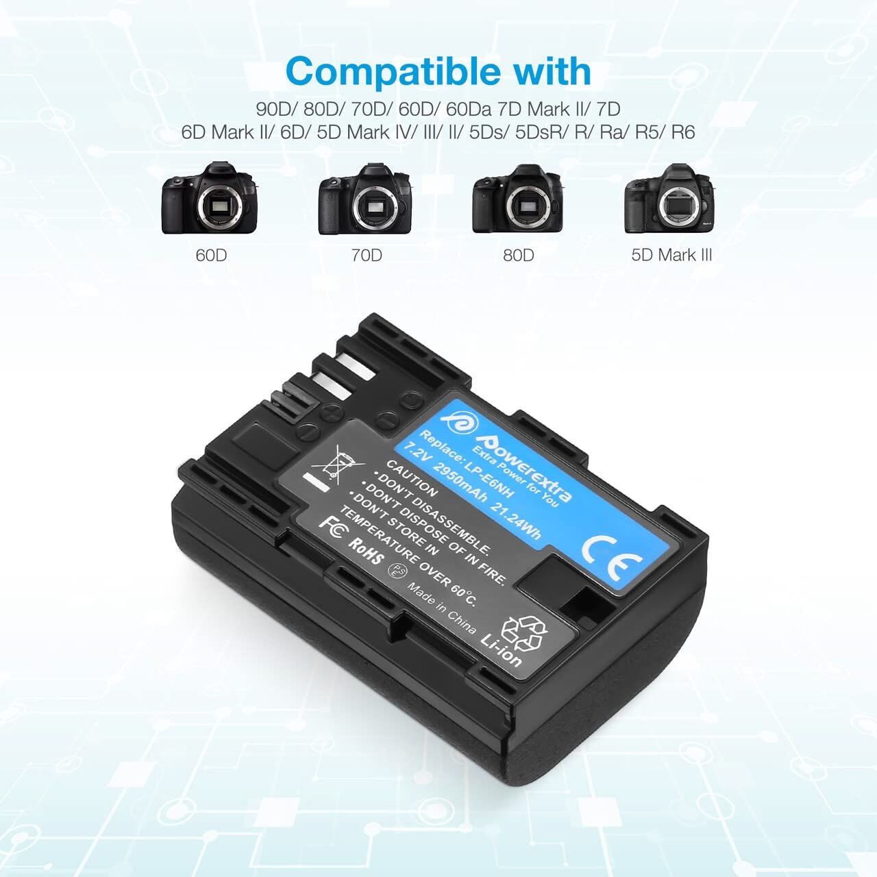 Rechargeable lithium-ion battery for LP-E6NH. Compatible with Canon R5, R6, 90D, 60D, 70D, 80D, 5D II, 5D III, 5D IV, 5Ds, 6D, 6D II, 7D, 7D Mark II Cameras.