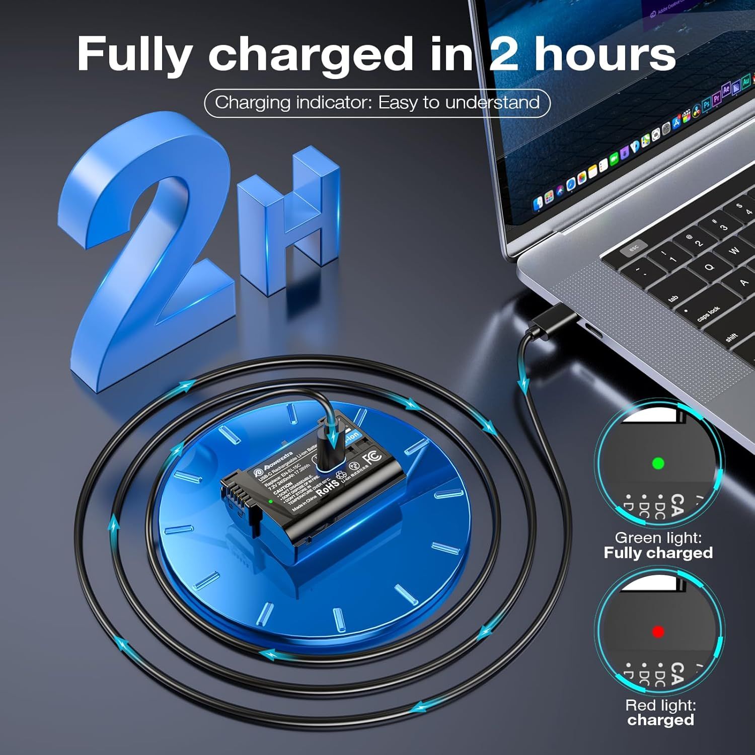 Φορτίζει τις μπαταρίες EN-EL15C ταυτόχρονα σε μόλις 2,5 ώρες με το παρεχόμενο καλώδιο USB-C. Δεν Απαιτείται Φορτιστής - Συνδέστε σε οποιαδήποτε θύρα USB (power bank, φορητό υπολογιστή, προσαρμογέα αυτοκινήτου). Έξυπνη Ένδειξη LED - Κόκκινη (φόρτιση) / Πράσινη (πλήρως φορτισμένη)