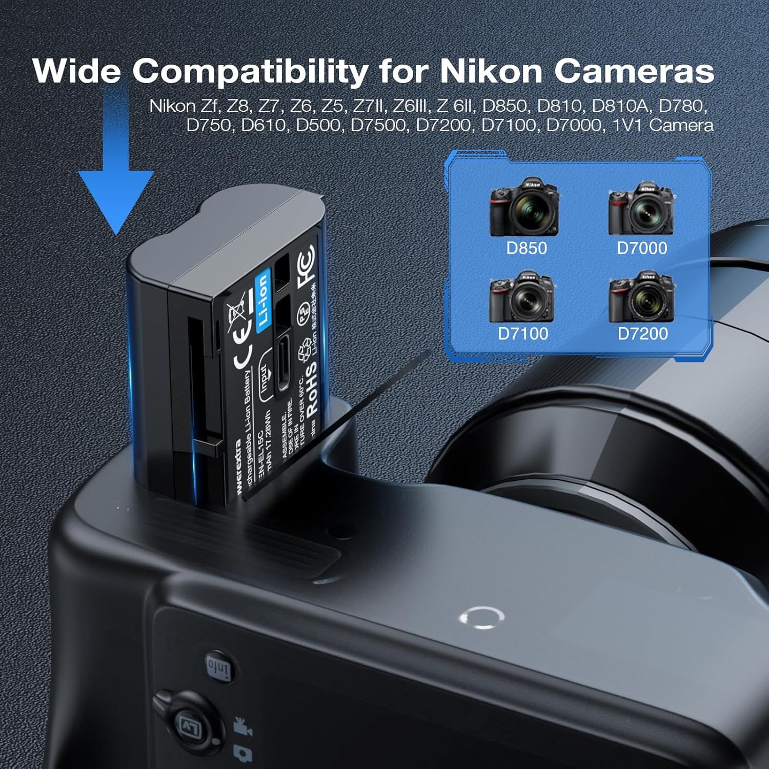 Δεν υπάρχουν Προειδοποιήσεις "Η Μπαταρία Δεν Αναγνωρίζεται" - Λειτουργεί άψογα συμβατή με Nikon ZF, Z5, Z6, Z6 II, Z7, Z7II, Z8, D500, D600, D610, D750, D780, D800, D800E, D810, D810A, D850,P520 P530, D7000, D7100, D7200, D7500, 1V1, κ.λπ.