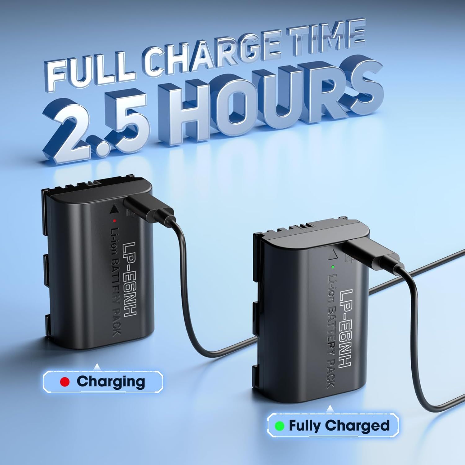 Η μπαταρία LP-E6NH είναι εξοπλισμένη με θύρα USB Type-C 5V/2A, εξασφαλίζοντας γρήγορη φόρτιση. Φορτίστε δύο μπαταρίες LP E6NH σε μόλις 2,5 ώρες, μειώνοντας τον χρόνο φόρτισης κατά 40% σε σύγκριση με τις παραδοσιακές μεθόδους. Μείνετε ενημερωμένοι με την ενδεικτική λυχνία φόρτισης - κόκκινη για φόρτιση και πράσινη για πλήρη φόρτιση.