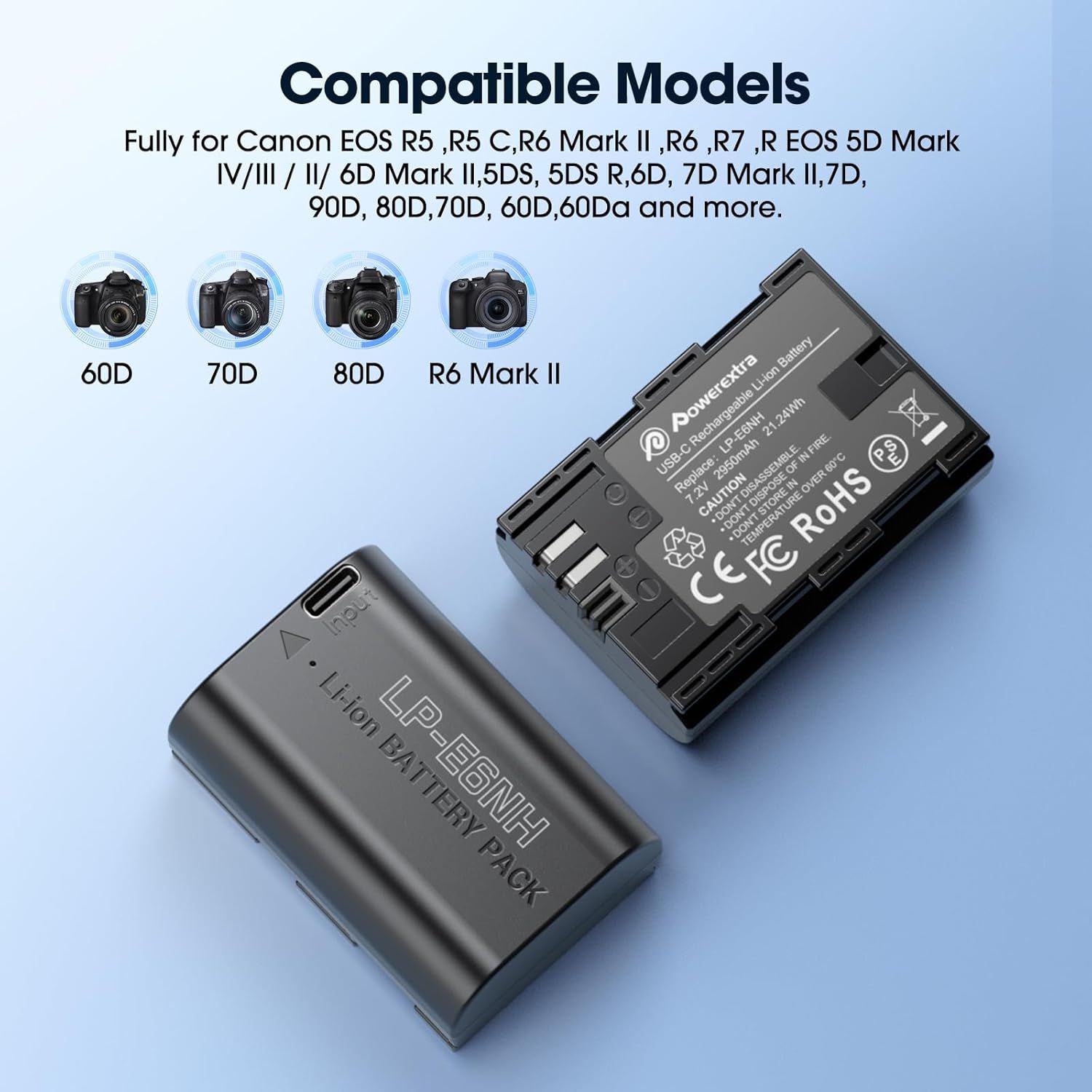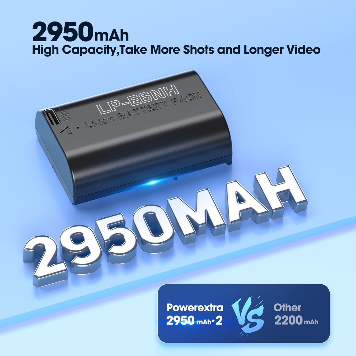 Yψηλή χωρητικότητα 2950mAh 7.2V 21.24Wh, η πλήρης αντικατάσταση της μπαταρίας Canon LP-E6NH. Η μπαταρία διαθέτει πλήρη κωδικοποίηση για να εμφανίζει τη στάθμη της μπαταρίας στην κάμερά σας, εξαλείφοντας τυχόν αναδυόμενα παράθυρα προειδοποίησης που μπορεί να υποδηλώνουν πιθανή ζημιά. Μεγαλύτερη χωρητικότητα από την αρχική μπαταρία, μεγαλύτερη διάρκεια και καταγραφή περισσότερων υπέροχων στιγμών.