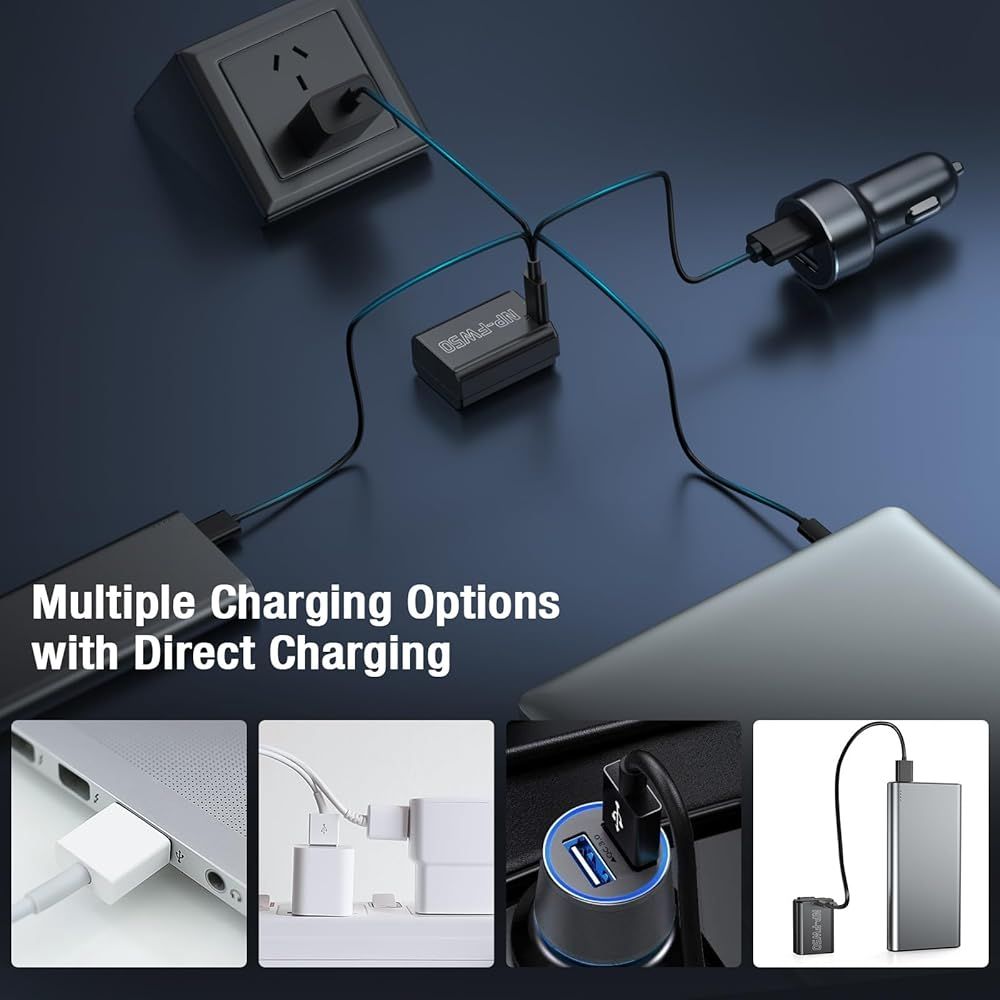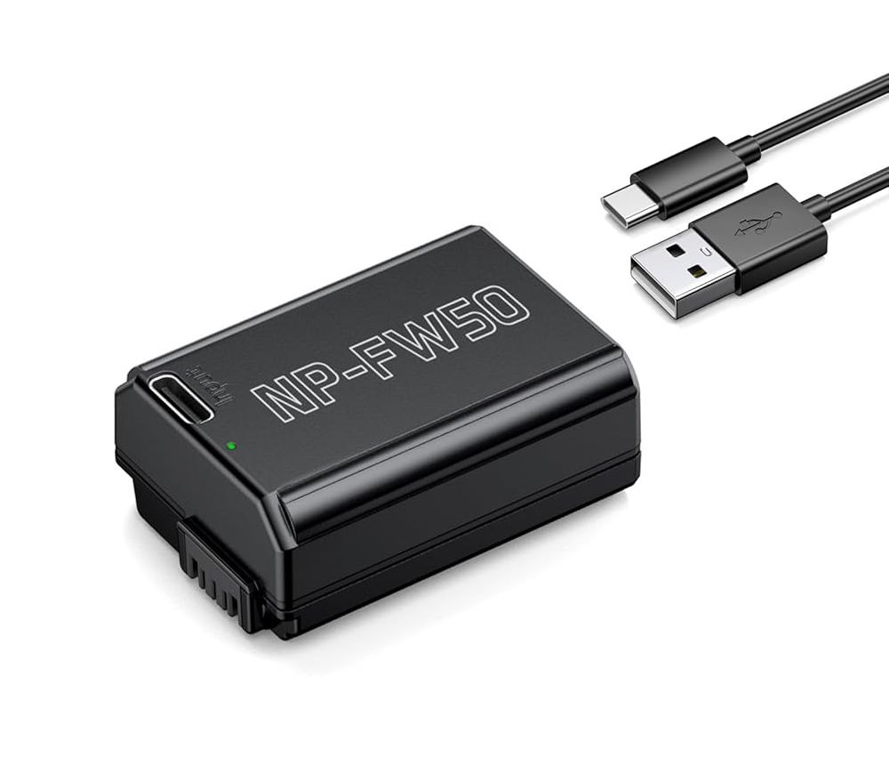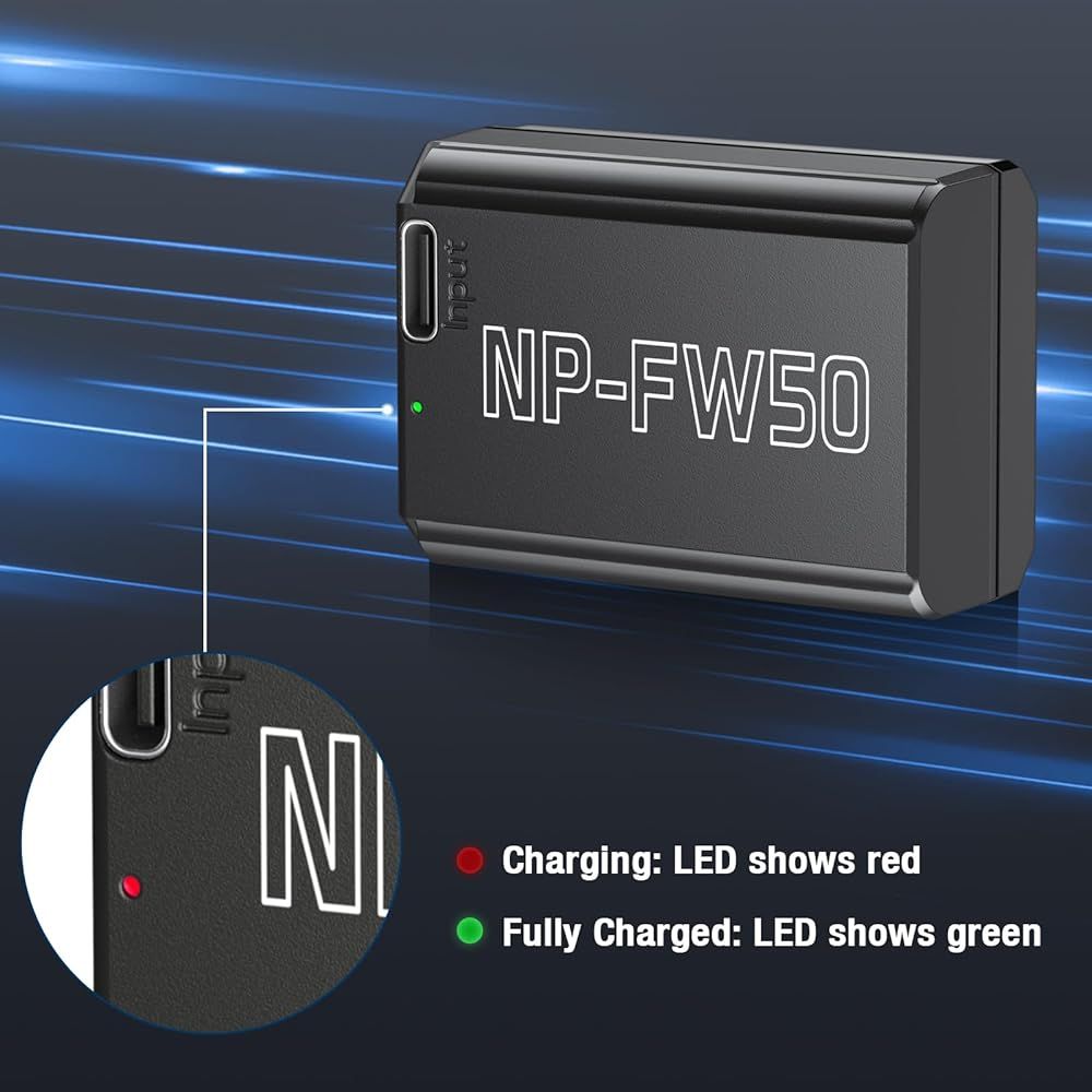 Η μπαταρία NP-FW50 διαθέτει ενσωματωμένη θύρα USB Type-C που μειώνει τον χρόνο φόρτισης κατά 30% σε σύγκριση με τις τυπικές μπαταρίες κάμερας USB-C και κατά 40% σε σχέση με τις συμβατικές μεθόδους φόρτισης. Με φόρτιση υψηλού ρεύματος 5V/1A.