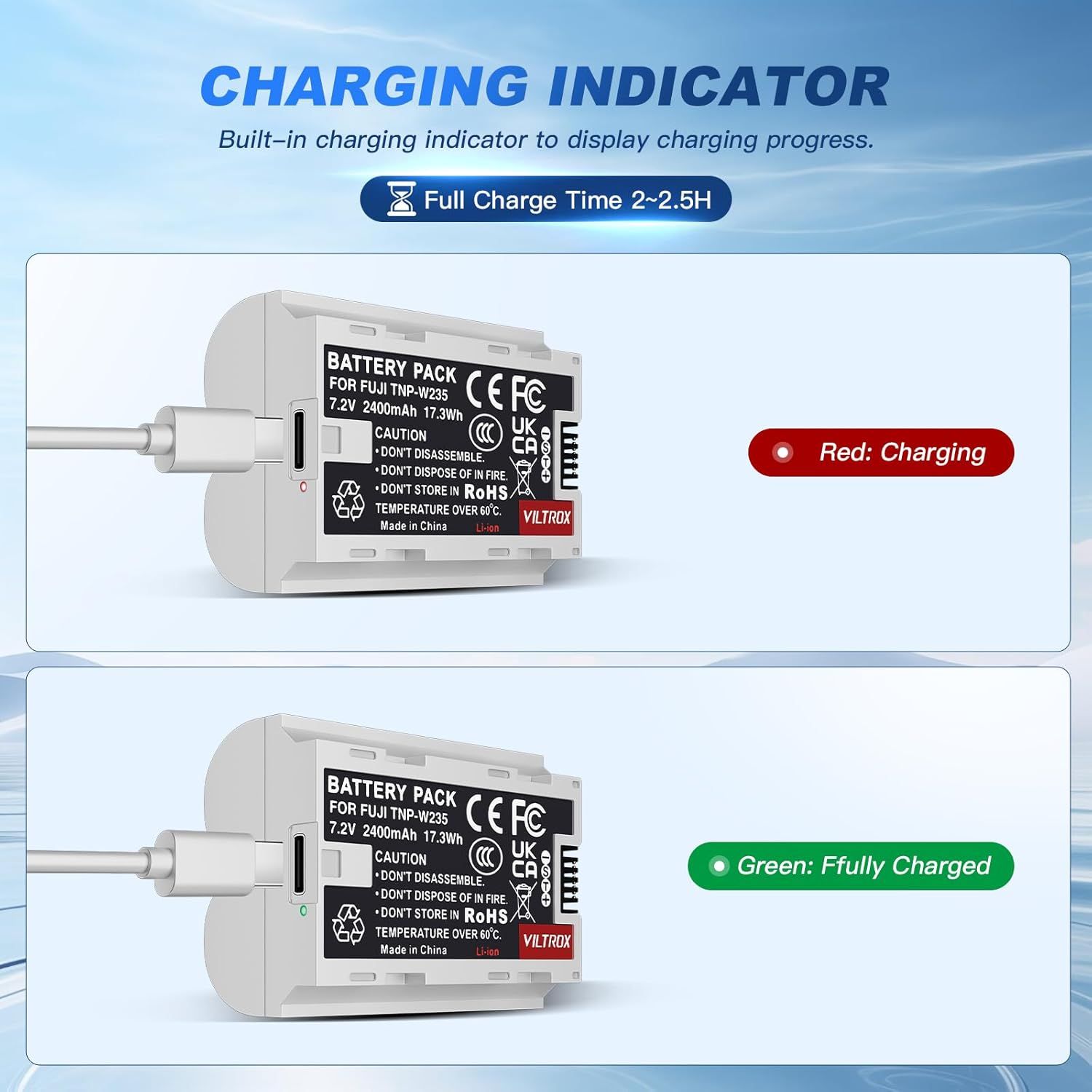 Το VILTROX NP-W235 διαθέτει διεπαφή φόρτισης USB-C, αυτή η μπαταρία NP-W235 δεν απαιτεί εξωτερικό φορτιστή και μειώνει τον χρόνο φόρτισης κατά 60% σε σύγκριση με τη συμβατική φόρτιση. Και υπάρχει ένα απλό LED που γίνεται κόκκινο κατά τη φόρτιση και γίνεται πράσινο όταν φορτίζεται πλήρως. (Σημείωση: το καλώδιο φόρτισης δεν περιλαμβάνεται)