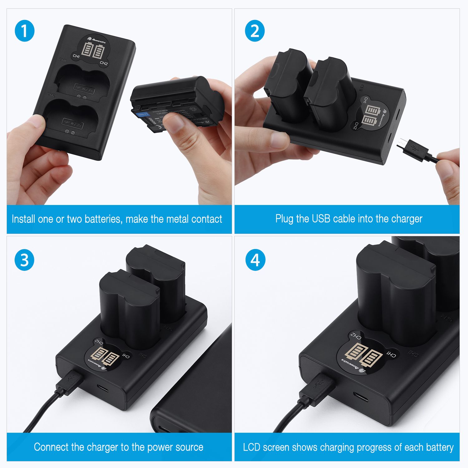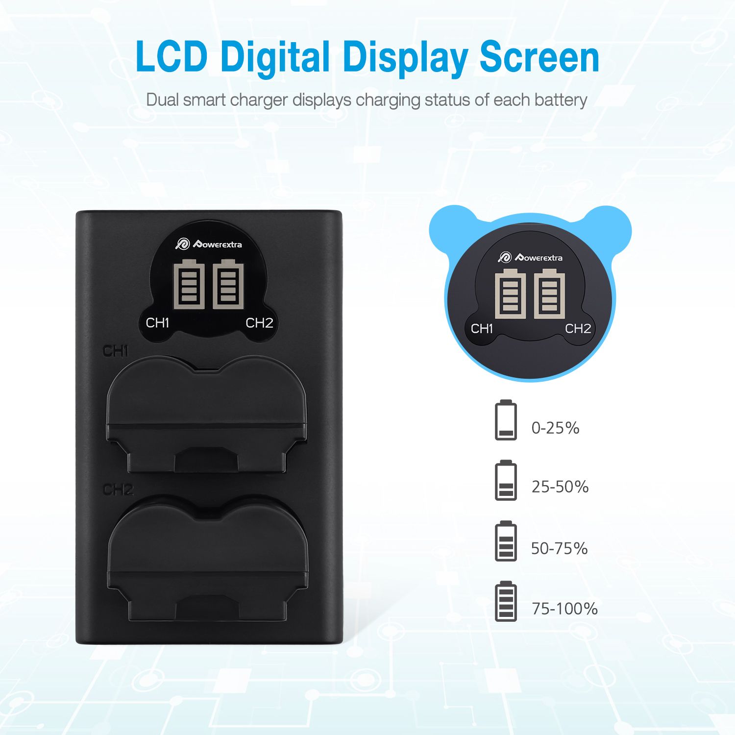 Two-slot charger offers quick charge for two batteries at a time. Get charging progress from LCD display anytime. Never miss any wonderful moment with your camera.
