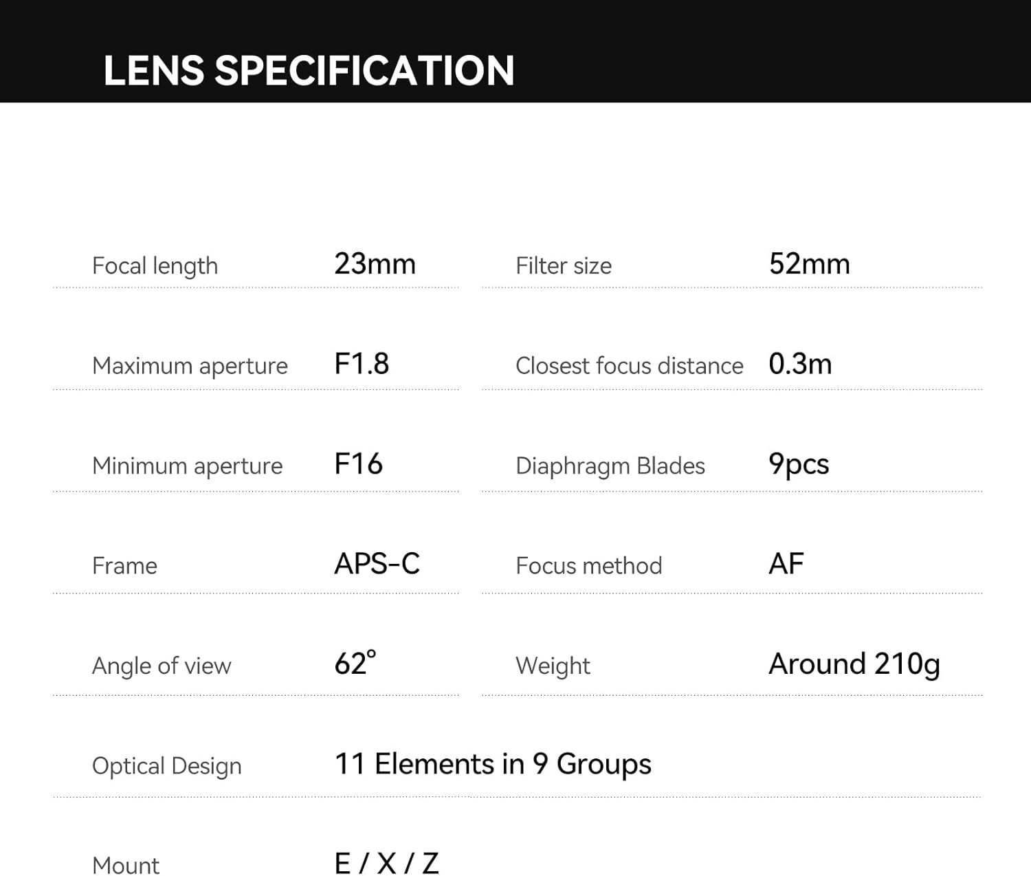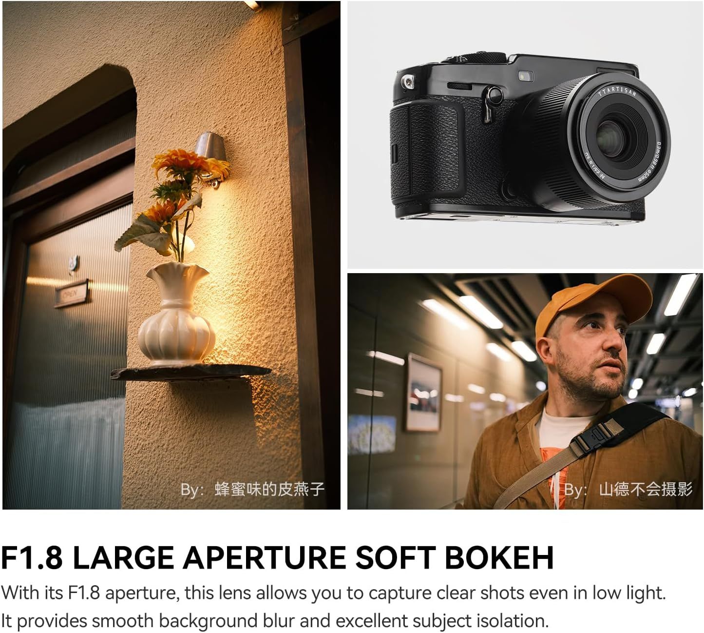 Ένας ελαφρύς, υψηλής απόδοσης prime φακός APS-C, ο φακός TTArtisan AF 23mm f/1.8 για κάμερες FUJIFILM X-mount εισάγει την αυτόματη εστίαση με STM σε έναν γρήγορο, κομψό σχεδιασμό. Ιδανικός για τη λήψη σκηνών δρόμου, τοπίων, πορτρέτων και άλλων, ο φακός προσφέρει ευκρινείς και καθαρές εικόνες με φυσική προοπτική και εστιακή απόσταση 35mm ισοδύναμη με full-frame. Το ανθεκτικό, αλουμινένιο σώμα αεροπορικής ποιότητας ζυγίζει μόλις 210 γρ., ιδανικό για χρήση όλη την ημέρα. Το γρήγορο διάφραγμα f/1.8 ωφελεί την απόδοση σε χαμηλό φωτισμό και τα εφέ μικρού βάθους πεδίου, όπως το bokeh και την απομόνωση του θέματος. Επιπλέον, η ελάχιστη απόσταση εστίασης 30 εκατοστά επιτρέπει λεπτομερή κοντινά πλάνα για τη φωτογράφιση τροφίμων, χειροτεχνιών και καθημερινών αντικειμένων.