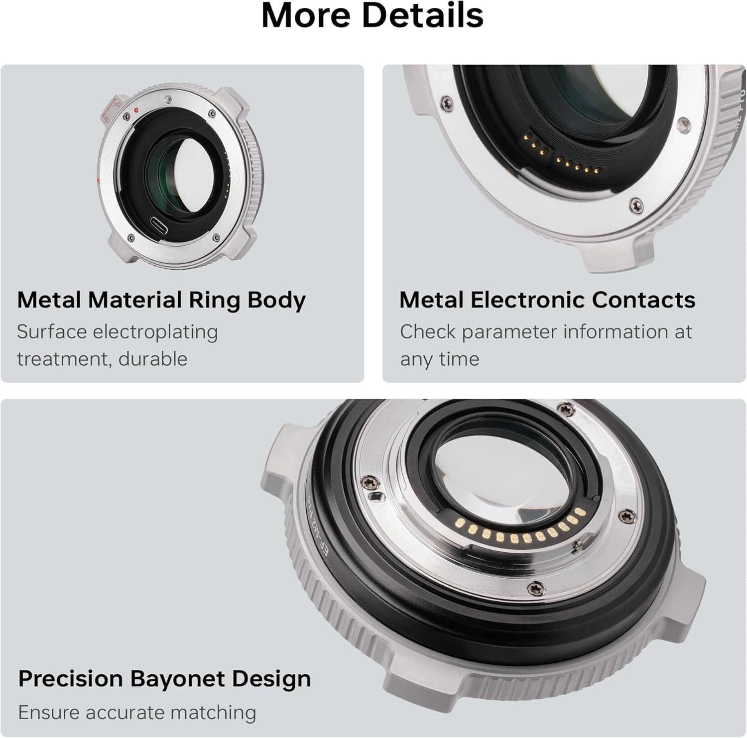 Κατασκευασμένος με ενισχυμένες ηλεκτρονικές επαφές από χαλκό, ο προσαρμογέας EF-M2 Pro θα σας προσφέρει γρήγορη ταχύτητα και ομαλή εμπειρία εστίασης. Μπορείτε επίσης να ρυθμίσετε το διάφραγμα του φακού EF ελέγχοντας το σώμα της κάμερας της σειράς M43.