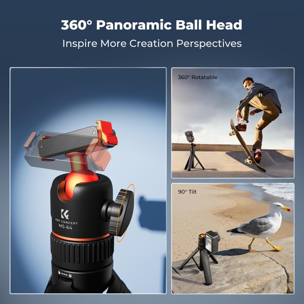Σχεδιασμός σφαιρικής κεφαλής που επιτρέπει περιστροφή 360° και κλίση 90°, επιτρέποντας ελεύθερη ρύθμιση γωνίας και κάθετη λήψη. Ενσωματωμένη διεπαφή σπειρώματος 1/4" στην σφαιρική κεφαλή, επιτρέπει την τοποθέτηση μικροφώνου ή φωτισμού πλήρωσης για καλύτερη λύση βίντεο.