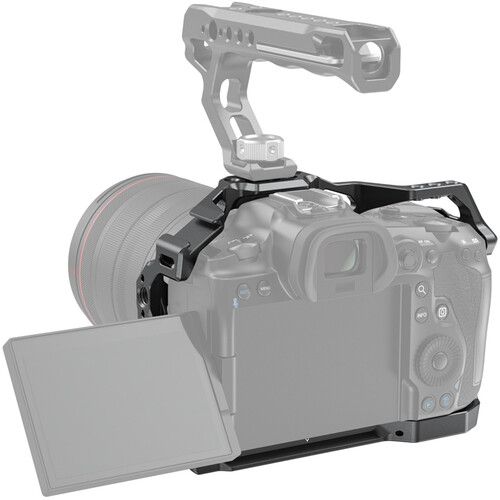 SmallRig Full Camera Cage for R5 & R6 &R5 C 2982B provides protection for the camera and a wide range of accessories mounting points to make a convenient work of videography. It is secured to a camera via one 1/4"-20 screw and two locating pins, with silicone cushions on the top and bottom to prevent scratches. The cage features multiple 1/4"-20 and 3/8"-16 threaded holes for attaching such accessories as Side Handle 2093, Top Handle 1984, and Arm with Ball Heads 2070. Its left side supports Cable Clamp 2981; its top comes with a cold shoe mount for microphones and LED lights. ARRI 3/8"-16 locating holes on the top and left and right sides fit ARRI Top Handle 2165, ARRI Side Handle HSS2426 & 2914. Holes on both sides and the bottom suit Hand Strap PAC2456, Wrist Strap PSW2398 and Shoulder Strap PSC2428. A built-in spanner removes bottom screws and can be slid out from the side without interfering with the attachment of a quick release plate. The right-hand side is designed to fit the camera handle for the original and comfortable grip feeling. Besides, the cage’s bottom Arca-type quick release plate and 1/4"-20 threaded holes allow connecting the original DJI RS2/RSC2 Arca-type plate, which can be mounted onto DJI RS2/RSC2 Manfrotto quick release plate and then onto the stabilizer.