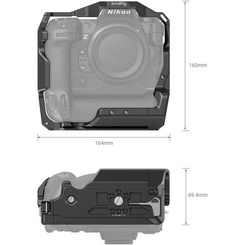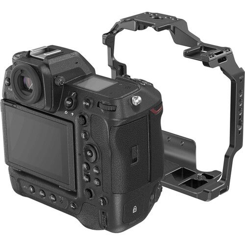This lightweight aluminum Camera Cage from SmallRig protects and provides accessory mounting for your Nikon Z9 camera. This formfitting cage maintains access to the camera's controls, battery, and SD card slot, and it features a variety of mounting options. The camera secures into the cage using three screw points to prevent twisting, and rubber padding on the base protects and further secures the camera.
