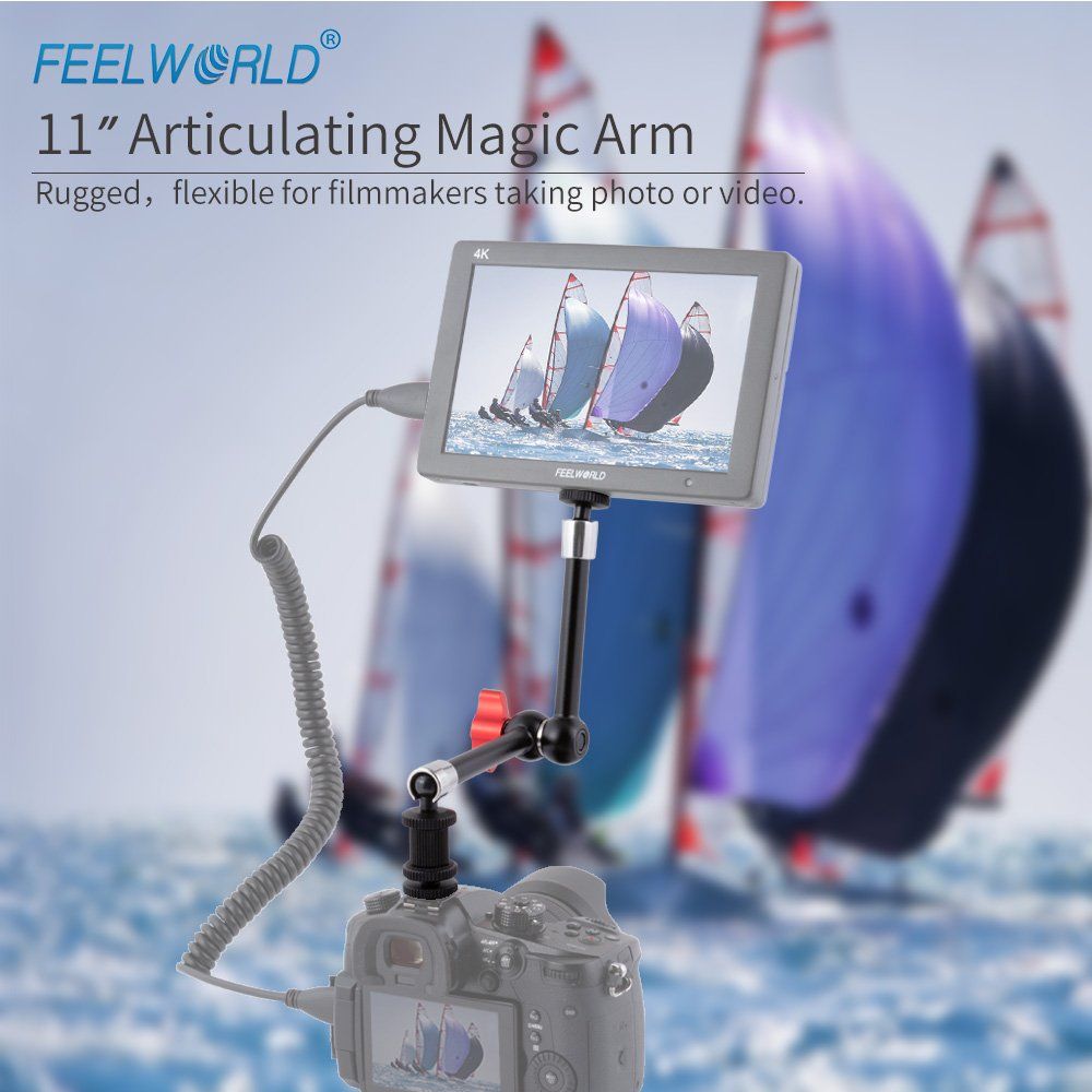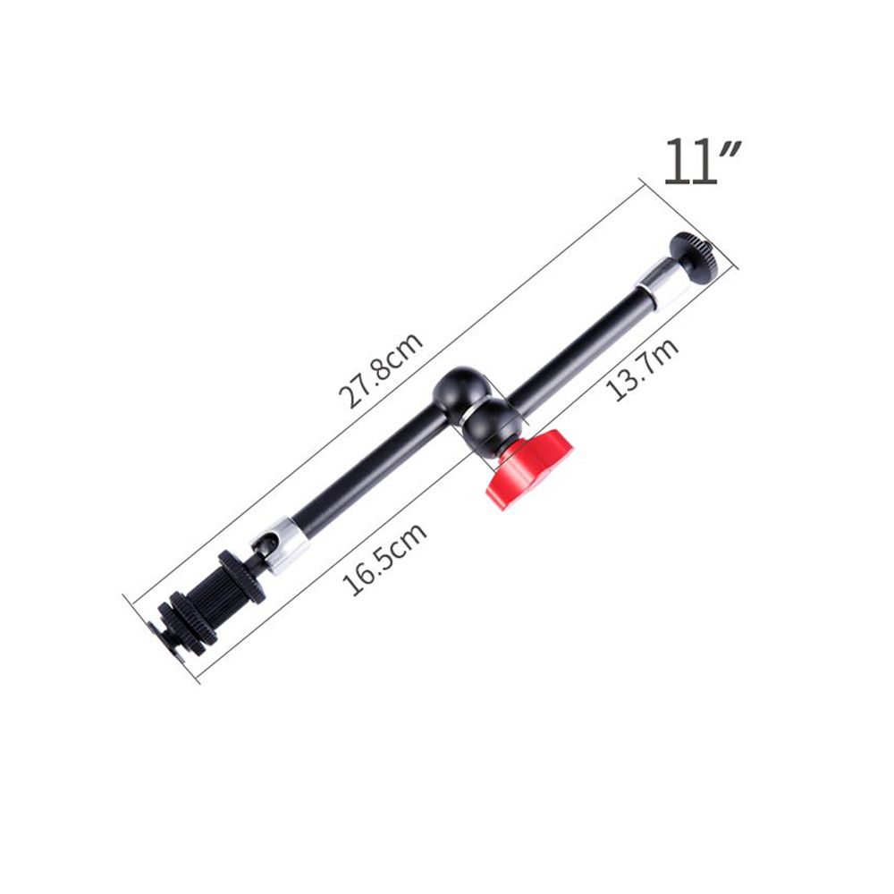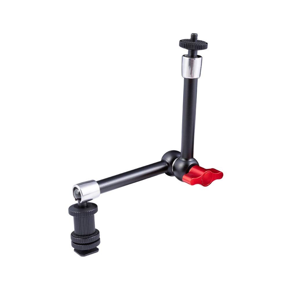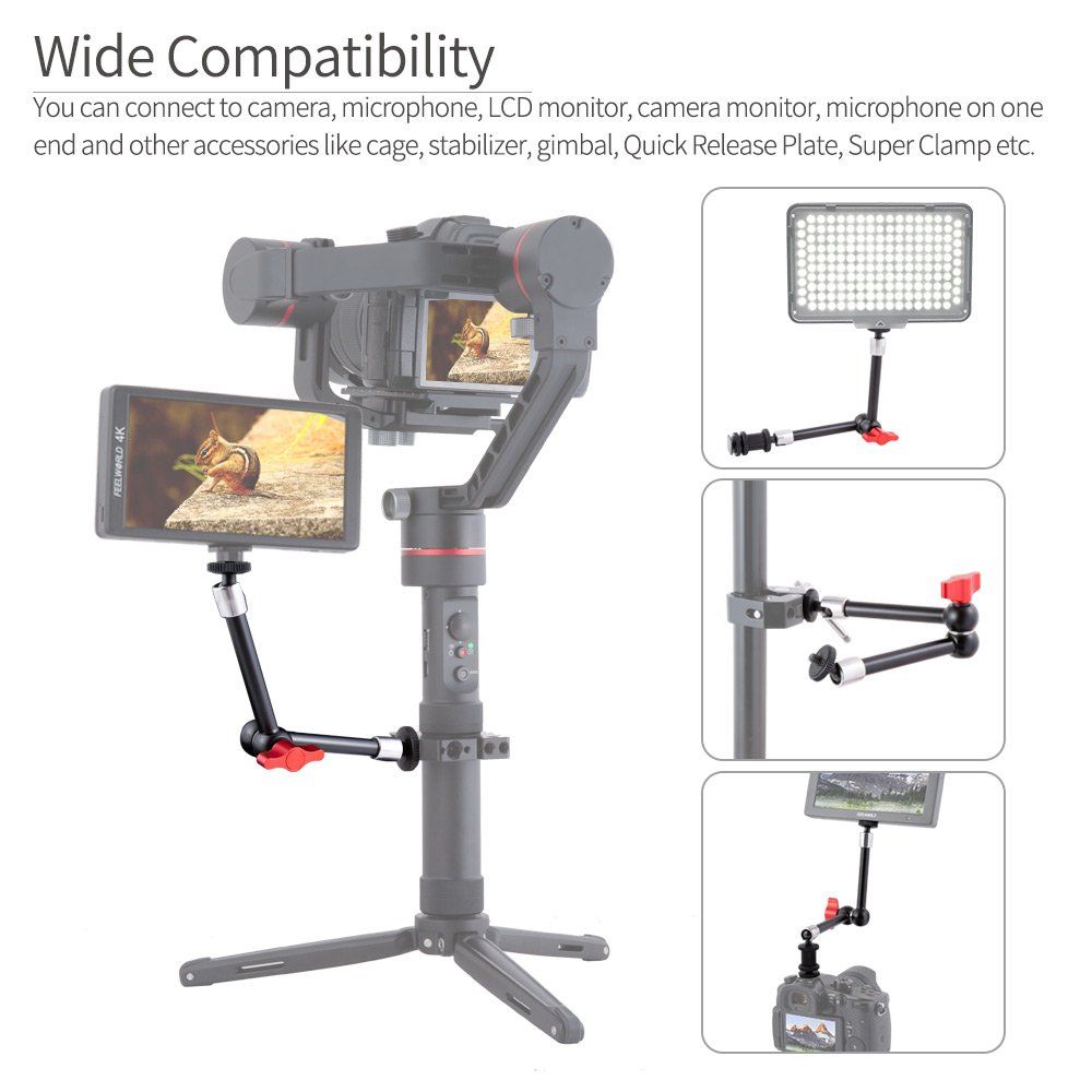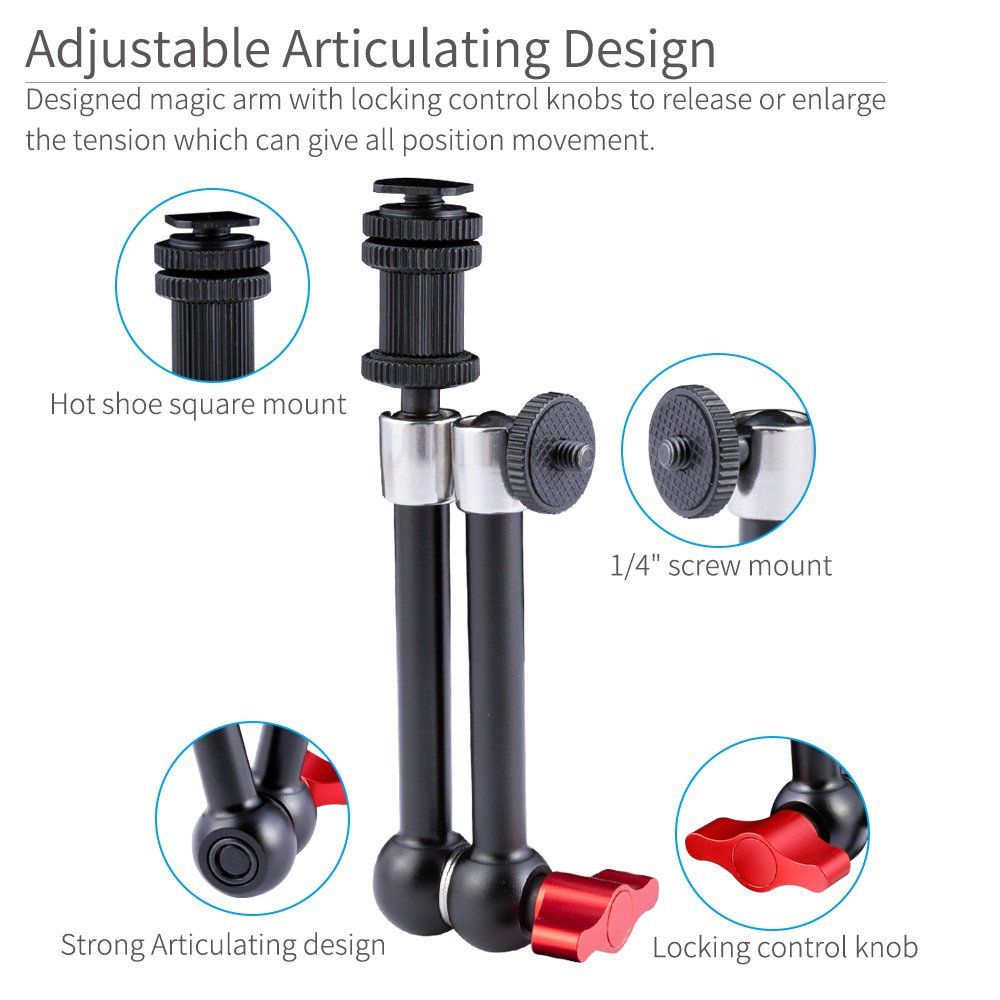 With 1/4'' thread mount on one end and hot shoe mount on the other end. Wide compatibility with any on-camera flash lights, LCD monitor, microphone etc. The 360 degree ball head articulating design with one knob to easily lock the magic arm in position.