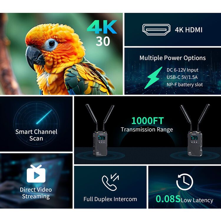 Αυτό το σύστημα σάς επιτρέπει να συνδέσετε έως και τέσσερις δέκτες στον πομπό για ταυτόχρονη μετάδοση και ο πομπός μπορεί να ενεργοποιηθεί ώστε να λειτουργεί ως δέκτης. Η οθόνη OLED τόσο στον πομπό όσο και στον δέκτη εμφανίζει την κατάσταση σύνδεσης, την ισχύ του σήματος, τη μορφή βίντεο, τη στάθμη μπαταρίας, τη θερμοκρασία, την κατάσταση του ανεμιστήρα και τη λειτουργία ενδοεπικοινωνίας.